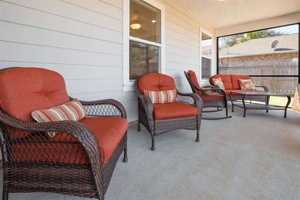 The living room has a 65-inch Roku TV. Roku TVs allow you to view your own streaming shows and will log you out automatically when you leave.